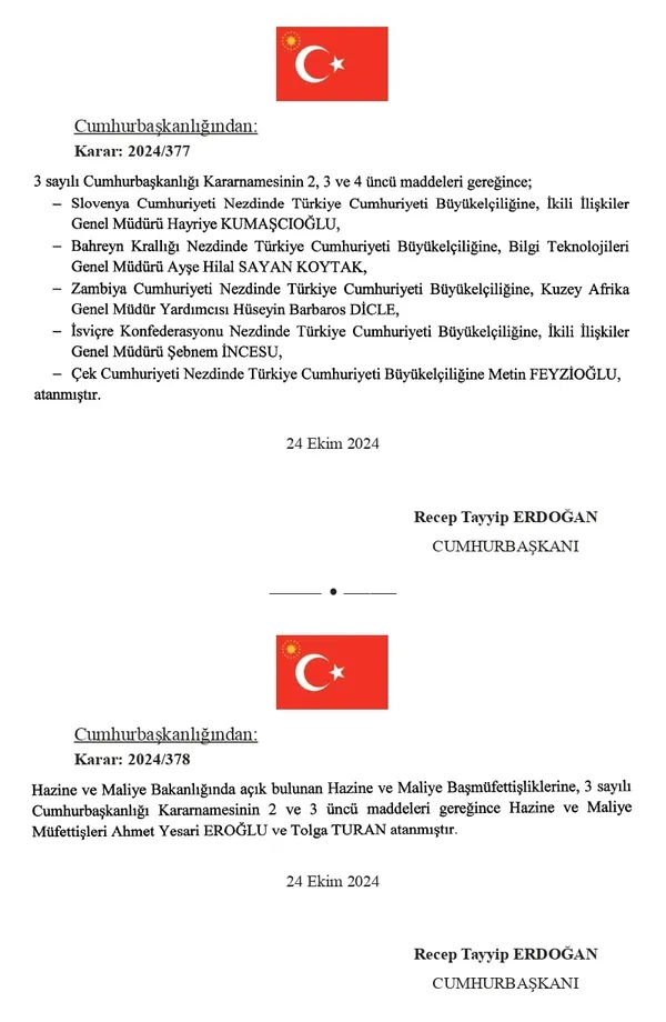 Başkan Recep Tayyip Erdoğan’ın imzasıyla yapılan büyükelçi atamalarına ilişkin kararlar, Resmi Gazete’de yayımlandı.